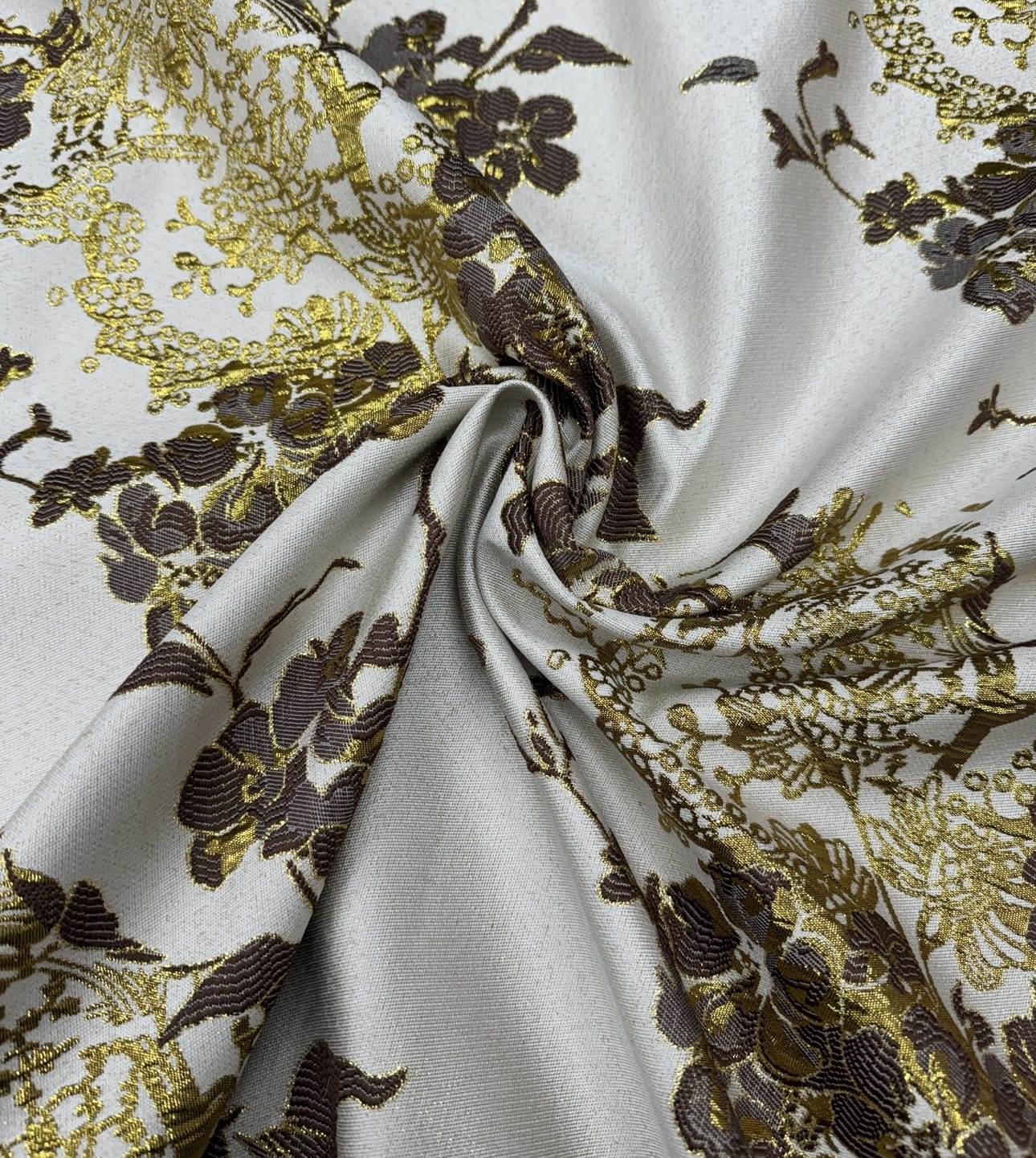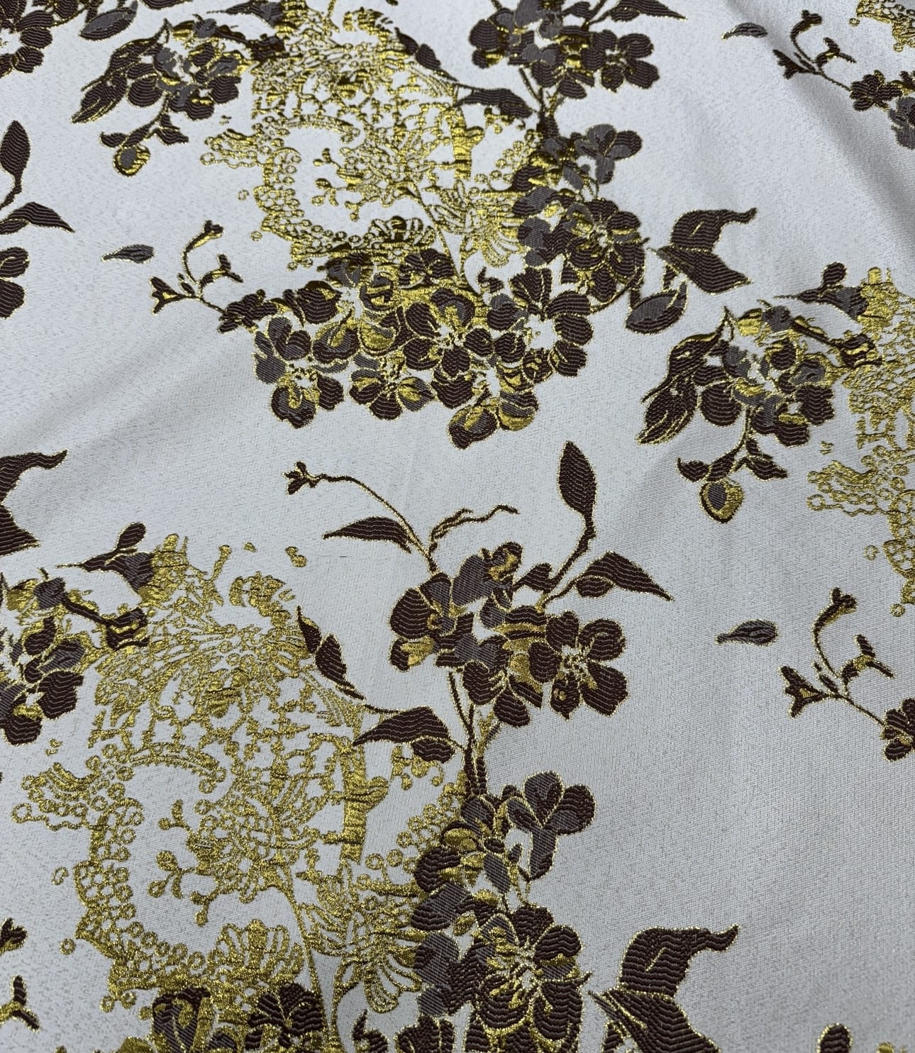Le tissu brocard est un textile luxueux, orné de motifs de palmes dorées sur un fond bleu profond. Idéal pour la création de vêtements de cérémonie, de robes de soirée, d’accessoires de haute couture, ainsi que pour la décoration d’intérieur, il convient parfaitement à des rideaux, coussins et autres éléments décoratifs, apportant une touche d’élégance et de raffinement à tout espace.