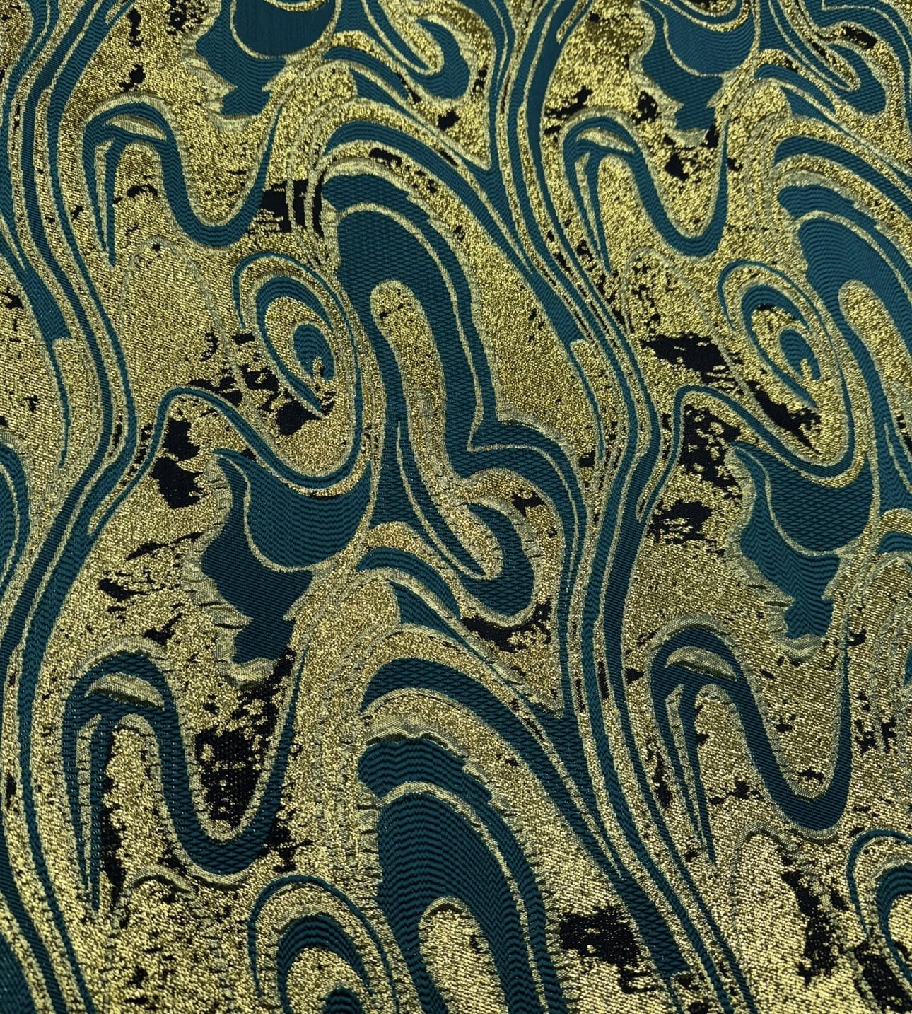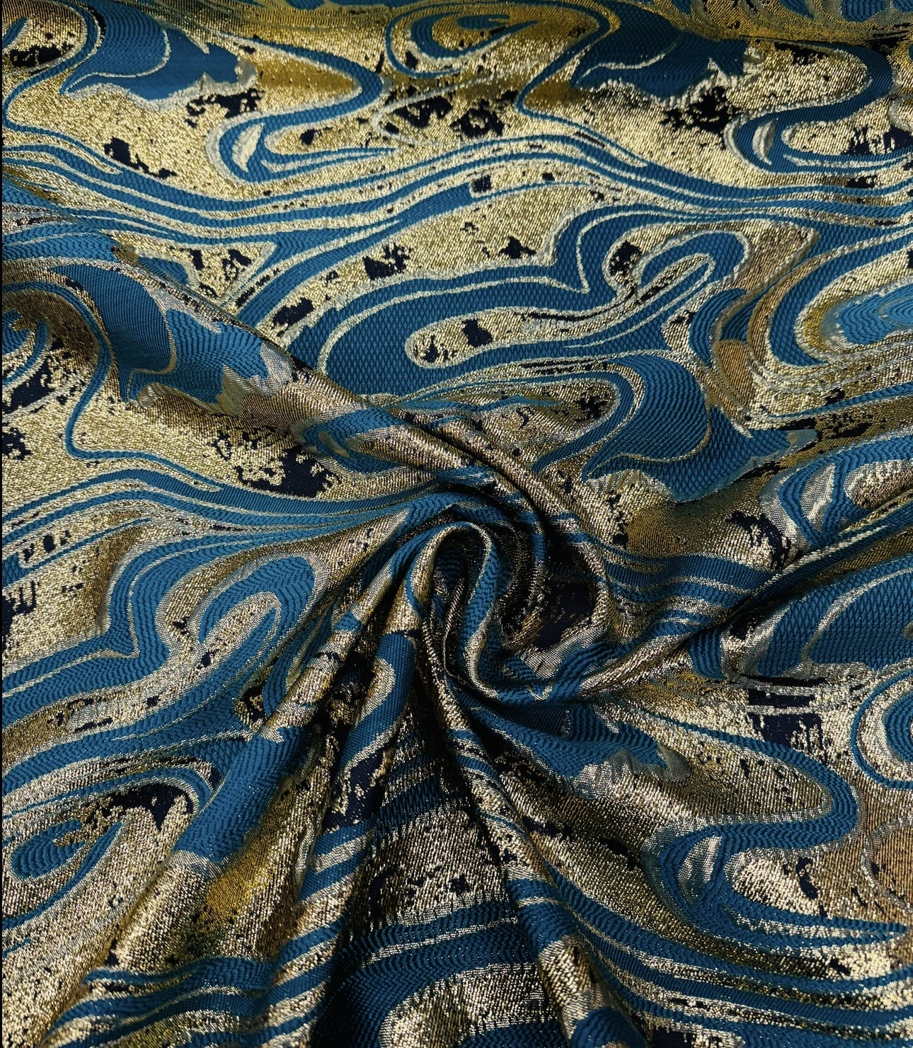 Le tissu brocard est un textile luxueux, orné de motifs de palmes dorées sur un fond bleu profond. Idéal pour la création de vêtements de cérémonie, de robes de soirée, d’accessoires de haute couture, ainsi que pour la décoration d’intérieur, il convient parfaitement à des rideaux, coussins et autres éléments décoratifs, apportant une touche d’élégance et de raffinement à tout espace.