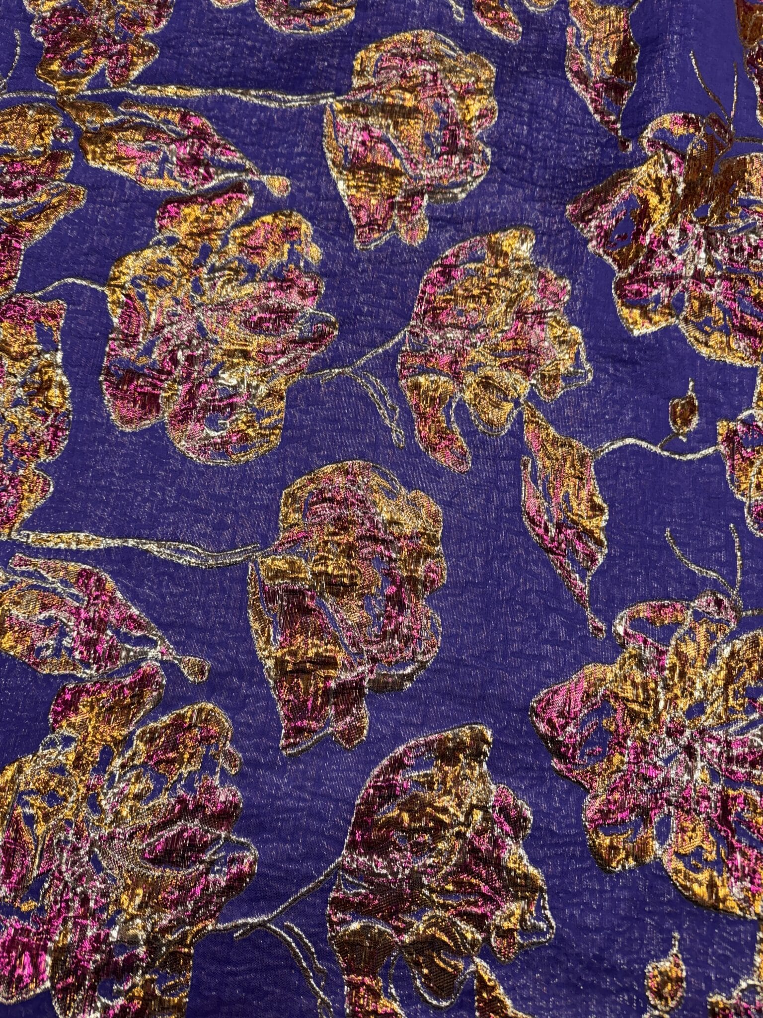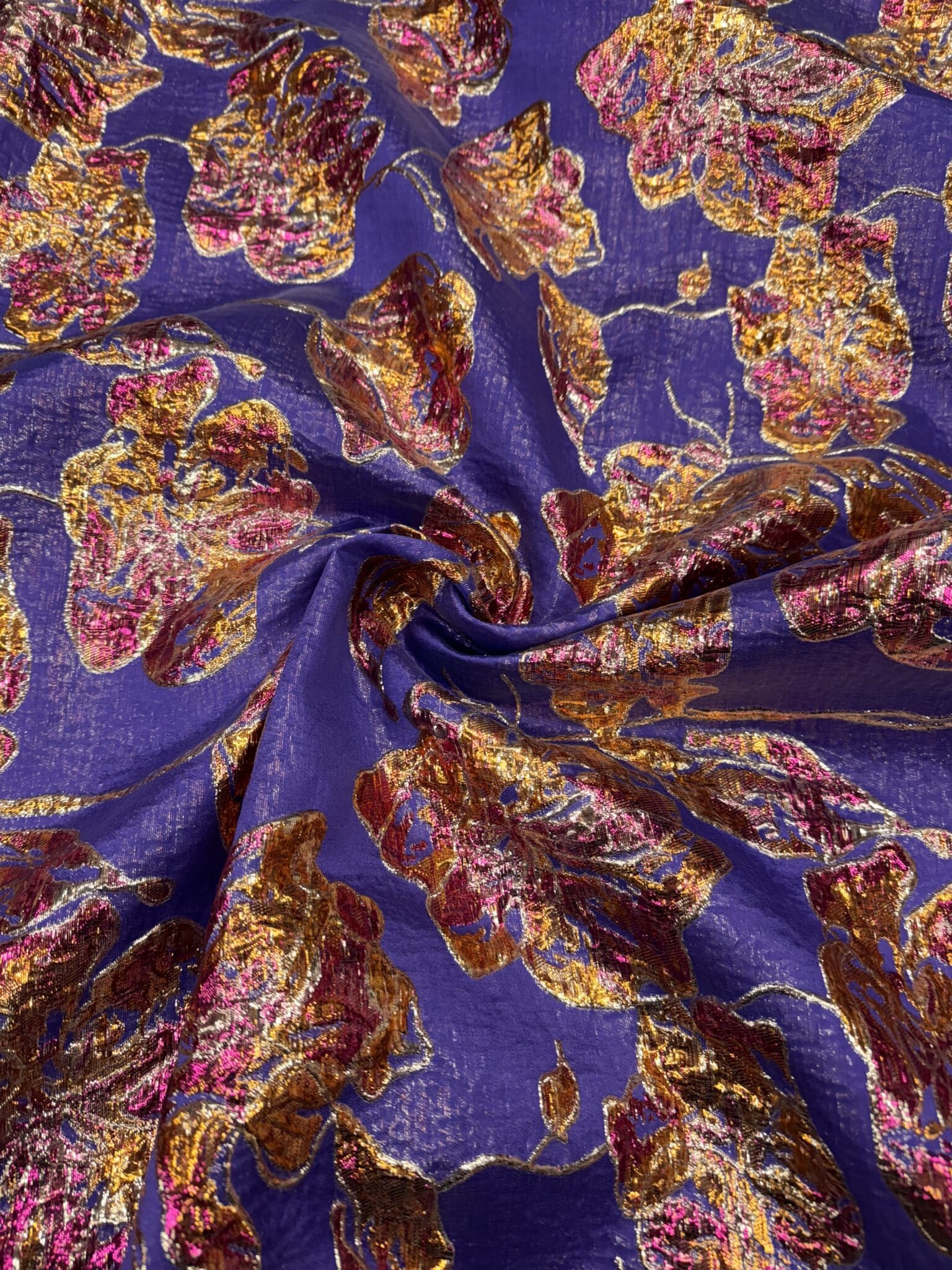 Le tissu brocard est un textile luxueux, orné de motifs de palmes dorées sur un fond bleu profond. Idéal pour la création de vêtements de cérémonie, de robes de soirée, d’accessoires de haute couture, ainsi que pour la décoration d’intérieur, il convient parfaitement à des rideaux, coussins et autres éléments décoratifs, apportant une touche d’élégance et de raffinement à tout espace.