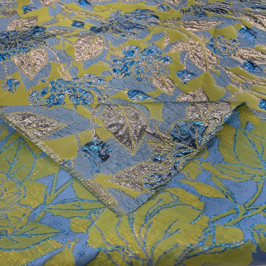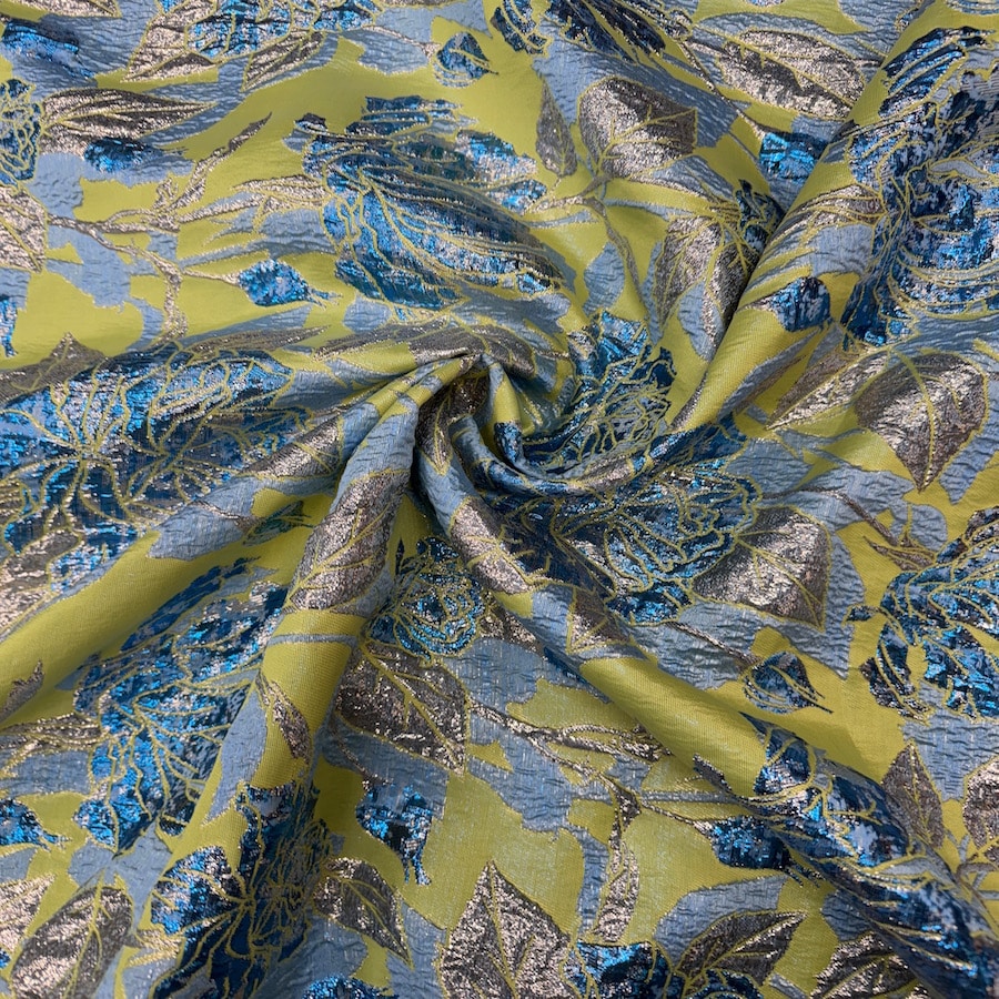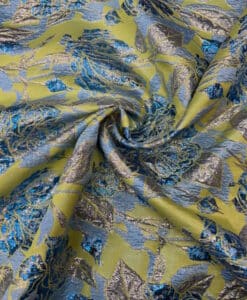 Le tissu brocard est un textile d’une élégance exceptionnelle, qui se distingue par ses motifs sophistiqués et sa texture somptueuse. Inspiré des motifs végétaux et des paysages exotiques, il présente des palmes dorées sur un fond bleu profond, créant une ambiance luxueuse et raffinée. Ce tissu est parfait pour la création de pièces de haute couture, telles que des robes de soirée, des tenues de gala, ou encore des costumes de théâtre. Grâce à sa richesse visuelle et tactile, le tissu brocard peut également être utilisé pour des vêtements de cérémonie, des accessoires de mode de luxe, ou même pour l’ameublement, ajoutant ainsi une touche de prestige et de sophistication à toute création.