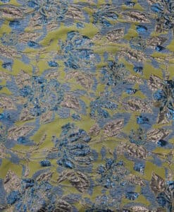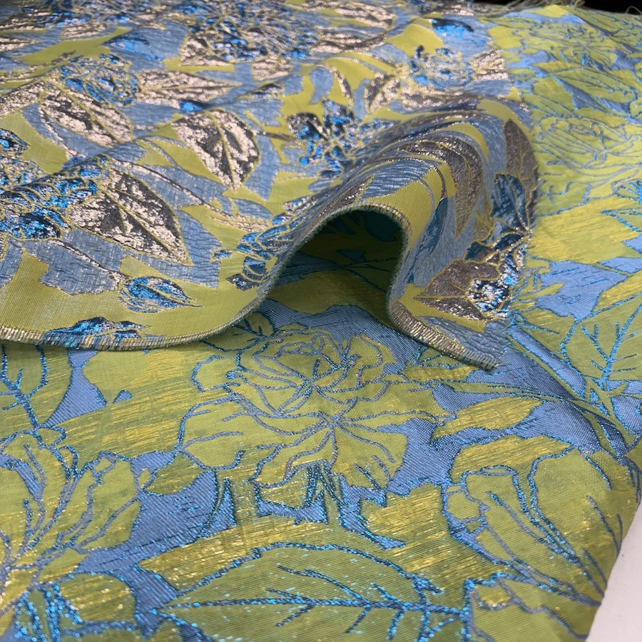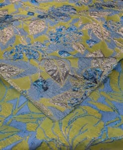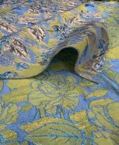 Le tissu brocard est un textile luxueux, orné de motifs de palmes dorées sur un fond bleu profond. Idéal pour la création de vêtements de cérémonie, de robes de soirée, d’accessoires de haute couture, ainsi que pour la décoration d’intérieur, il convient parfaitement à des rideaux, coussins et autres éléments décoratifs, apportant une touche d’élégance et de raffinement à tout espace.